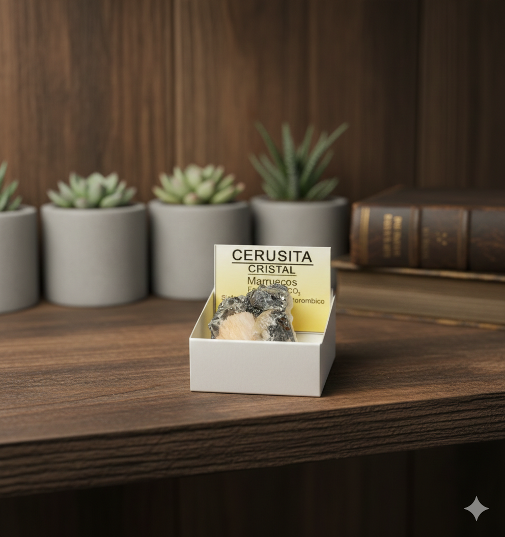 La Cerusita es uno de los minerales más fascinantes y estéticos que existen. Conocida por su altísimo brillo (denominado «adamantino» por ser similar al del diamante), esta pieza proviene de los famosos yacimientos de Marruecos. Es un cristal que destaca por su peso, su geometría ortorrómbica y su capacidad para reflejar la luz de una manera espectacular.