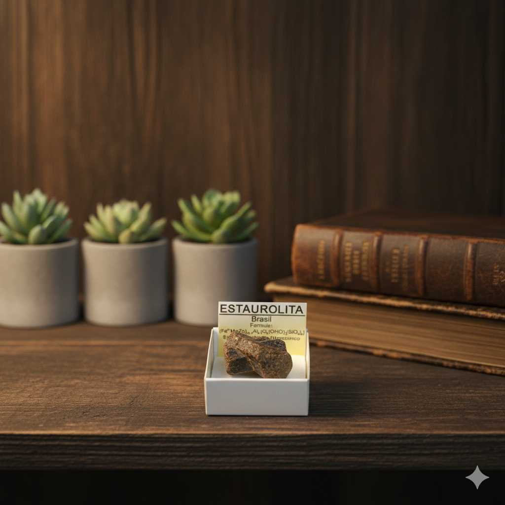 La Estaurolita es uno de los milagros más curiosos de la cristalografía. Su nombre proviene del griego stauros (cruz) y lithos (piedra), debido a su asombrosa capacidad de formar maclas en forma de cruz de manera totalmente natural. Esta pieza, extraída en Brasil, es un ejemplar de colección que une la ciencia geológica con la mística más antigua.