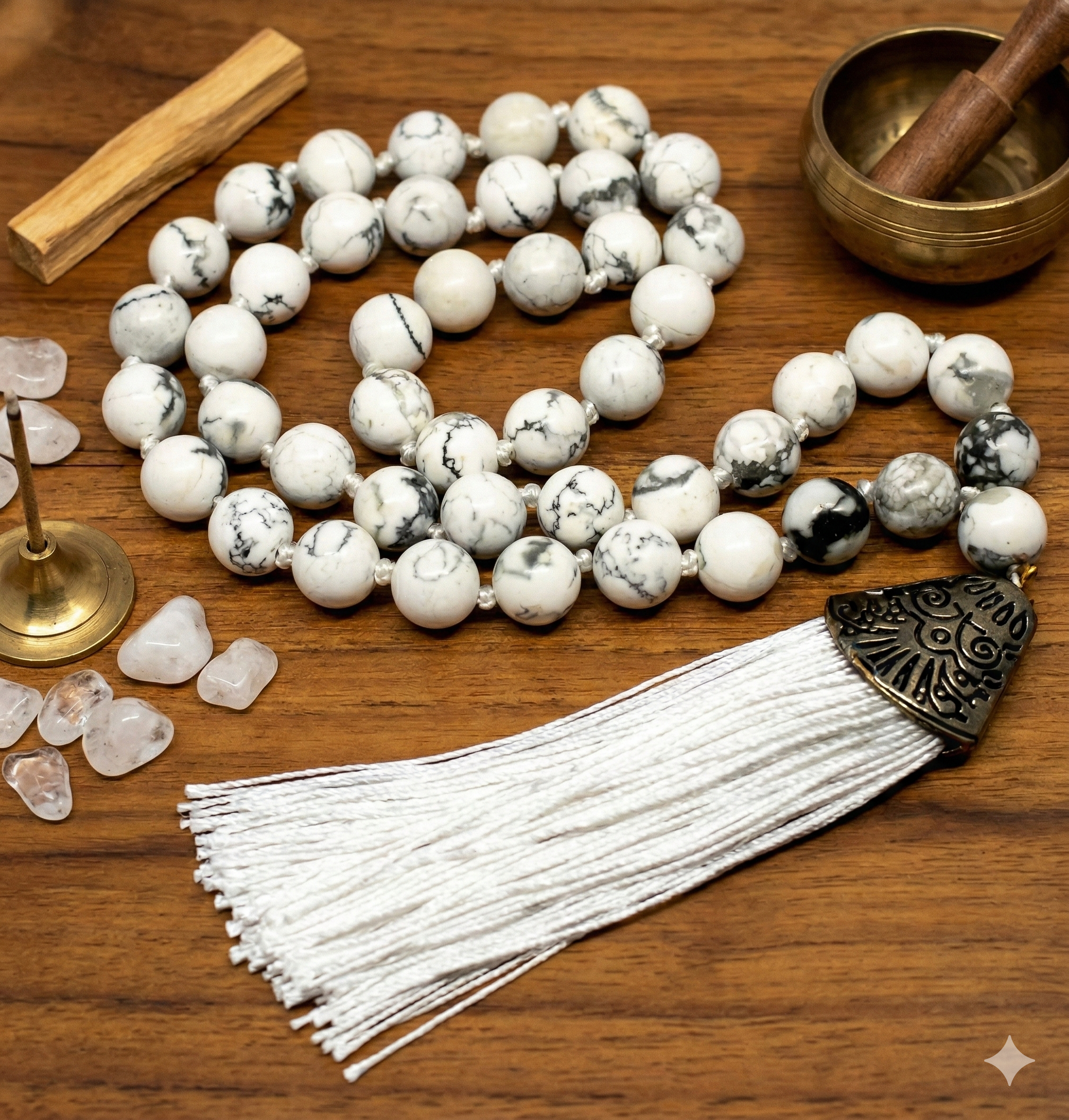 • Conteo Exacto: 45 cuentas de piedra natural (Howlita) + cuenta «Gurú» decorativa.