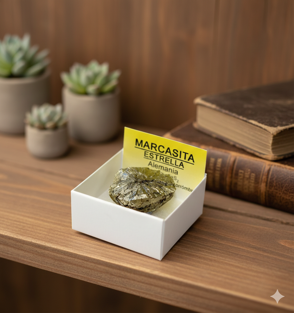 Lleva a tu colección una pieza única de la naturaleza. La Marcasita Estrella, proveniente de los yacimientos de Alemania, es conocida por su fascinante estructura radial que recuerda a un sol o una estrella dorada. Es un mineral que destaca no solo por su brillo metálico, sino por su geometría sagrada natural.