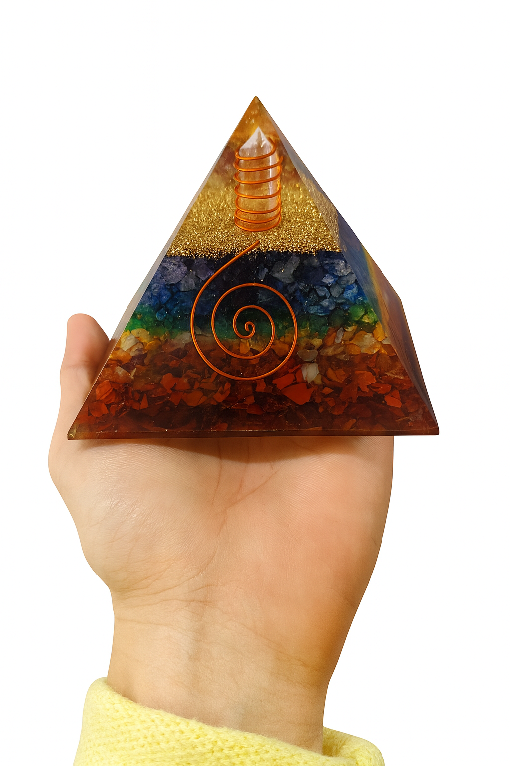 Elaborada artesanalmente con resina, metales, cuarzo y cristales de colores correspondientes a cada chakra, esta pirámide de 9×9 cm ayuda a transformar la energía negativa en positiva, generando armonía y bienestar.