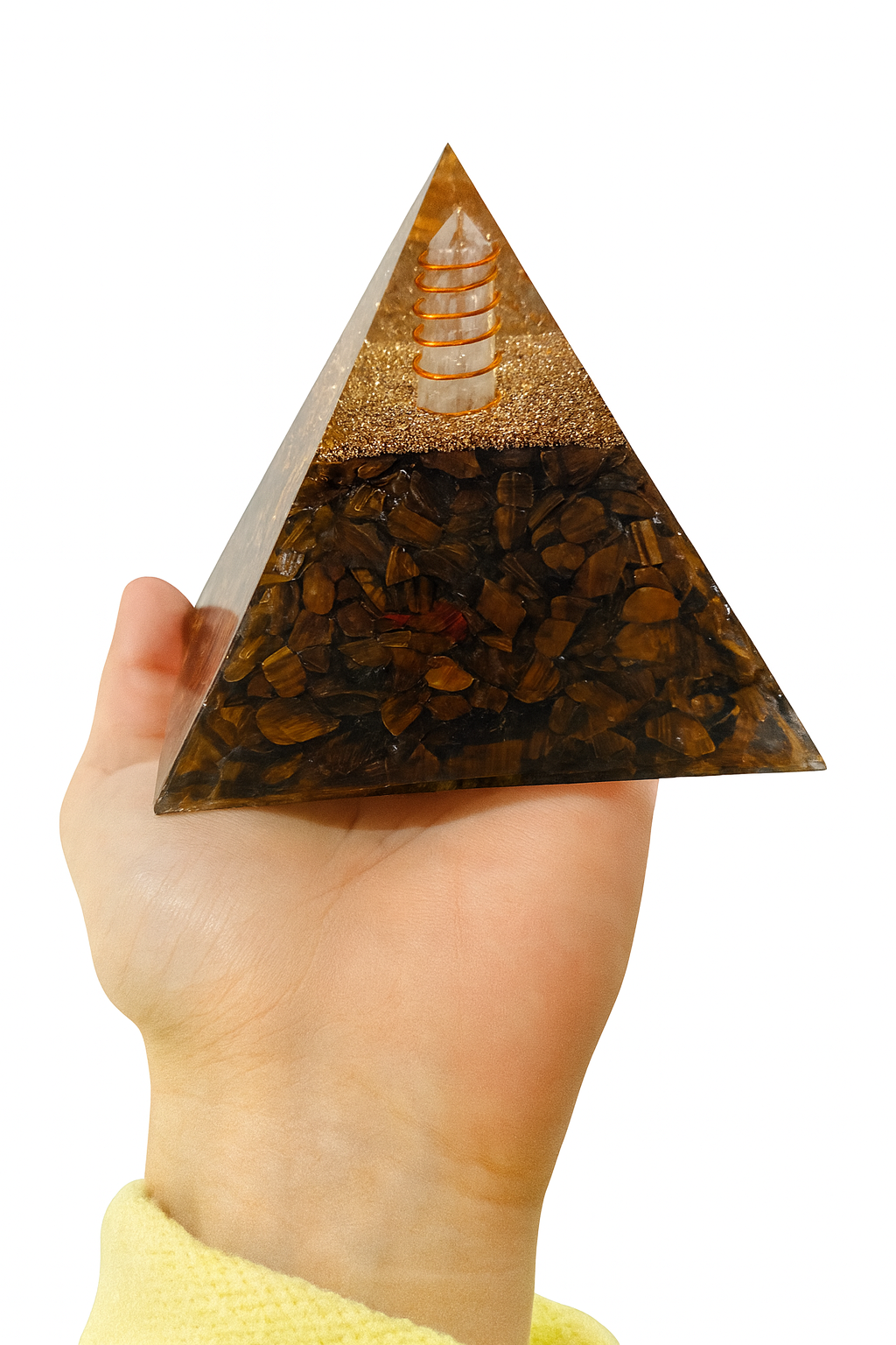 Su diseño en forma de pirámide (9×9 cm) potencia la concentración y la estabilidad, mientras que la combinación de Ojo de Tigre y Cuarzo Blanco genera una sinergia perfecta entre fuerza, claridad y protección espiritual.