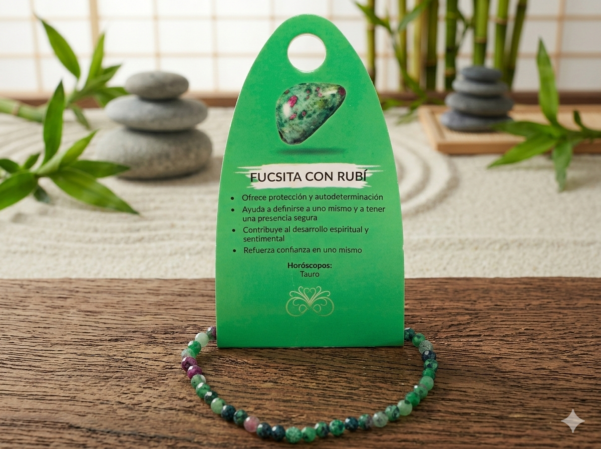 Nota sobre la naturaleza del mineral: Al ser un mineral 100% natural, cada pulsera es única e irrepetible. El color puede variar entre diferentes intensidades de verde y la cantidad de rubí presente en cada cuenta. Al igual que el resto de nuestros minerales, la forma y el tono pueden cambiar ligeramente respecto a la imagen, lo que garantiza la autenticidad de tu pieza.