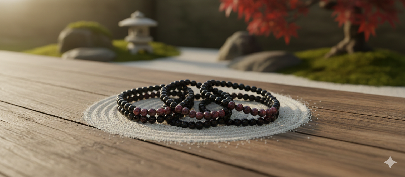 Pulsera Obsidiana Negra y Granate (6mm)Fuerza y protección