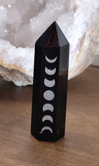 Elegante punta de obsidiana negra pulida de aproximadamente 9 cm de altura, adornada con un grabado de fases lunares en tono plateado que le otorgan un toque místico y decorativo. Cada pieza es única en color, forma y vetas, ya que está elaborada a partir de un mineral natural.